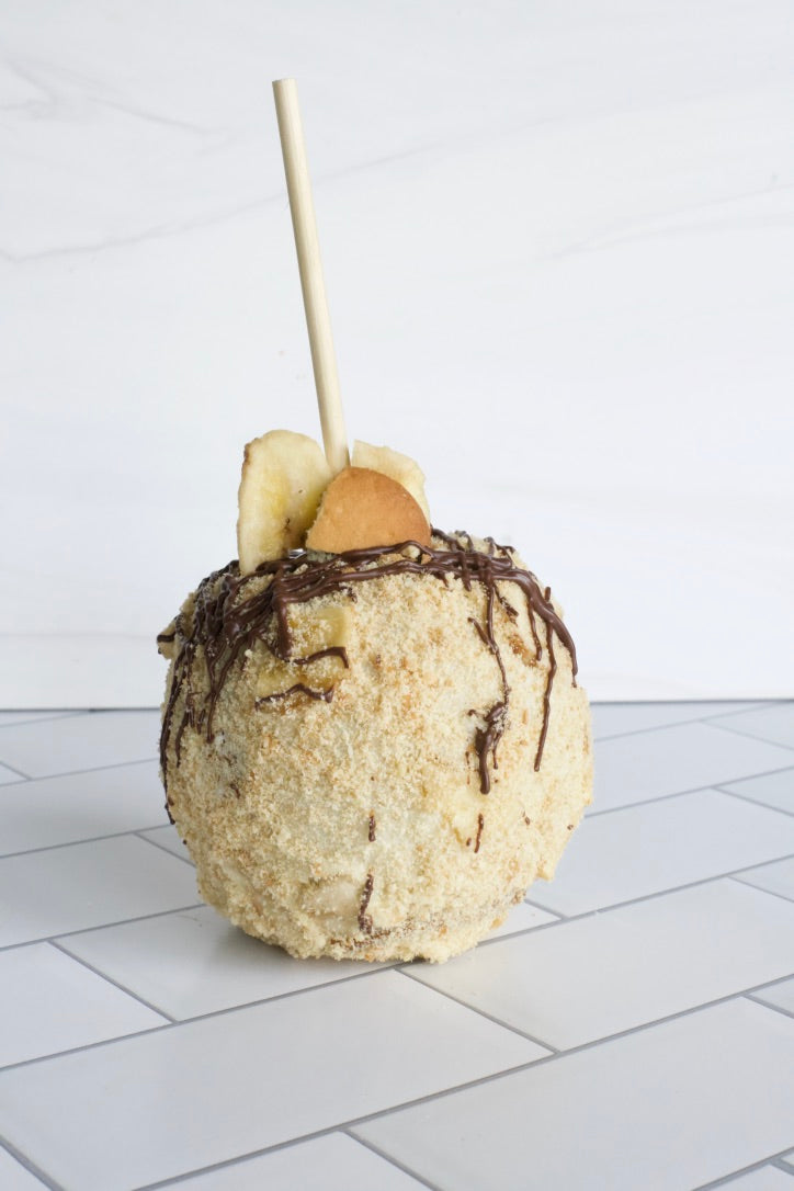 Our Banana Pudding Caramel Gourmet Apple consist of a delicious Granny Smith Apple dipped in top quality homemade Caramel sauce and White Chocolate. Toppings include crushed Banana Chips and Vanilla Wafers.
