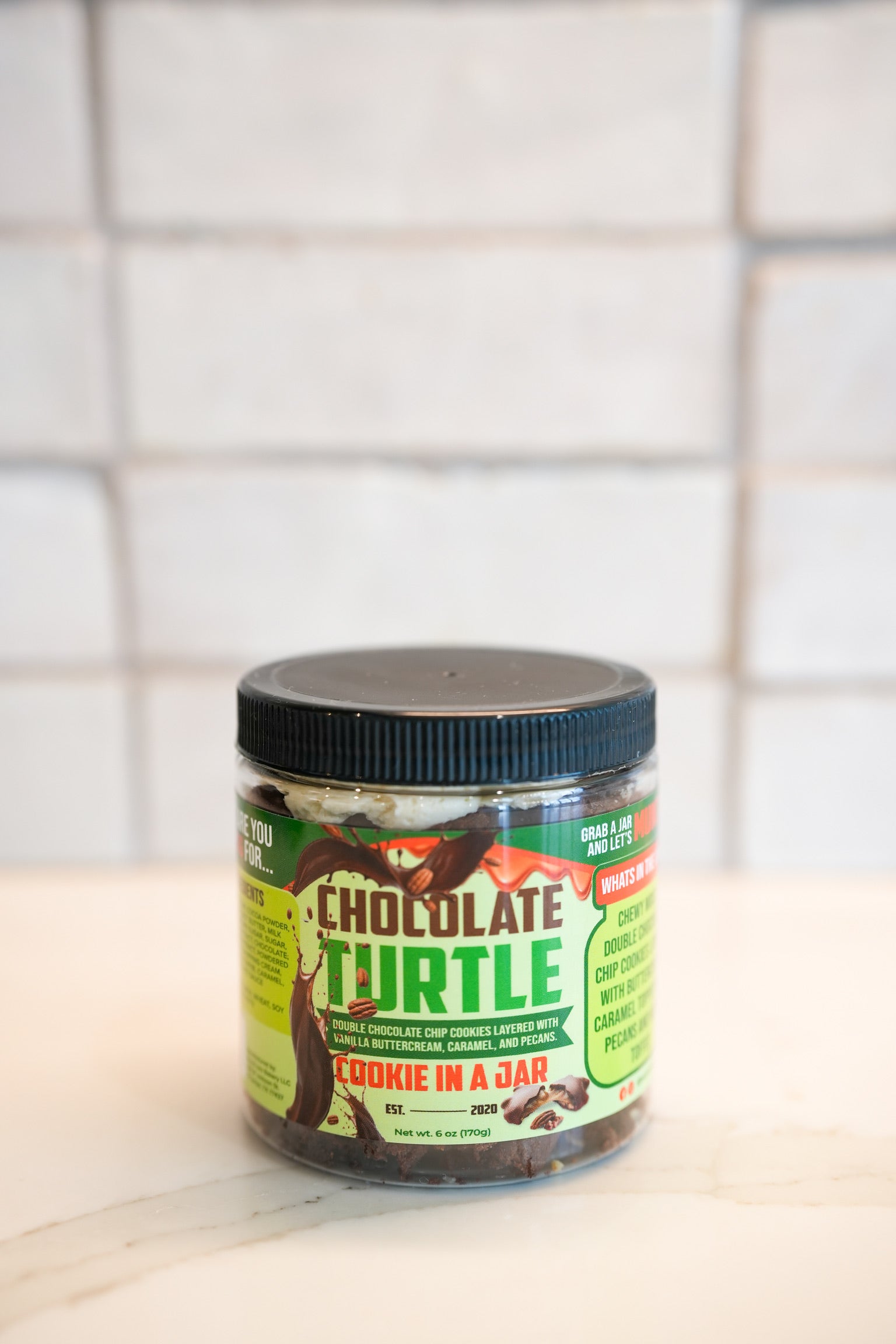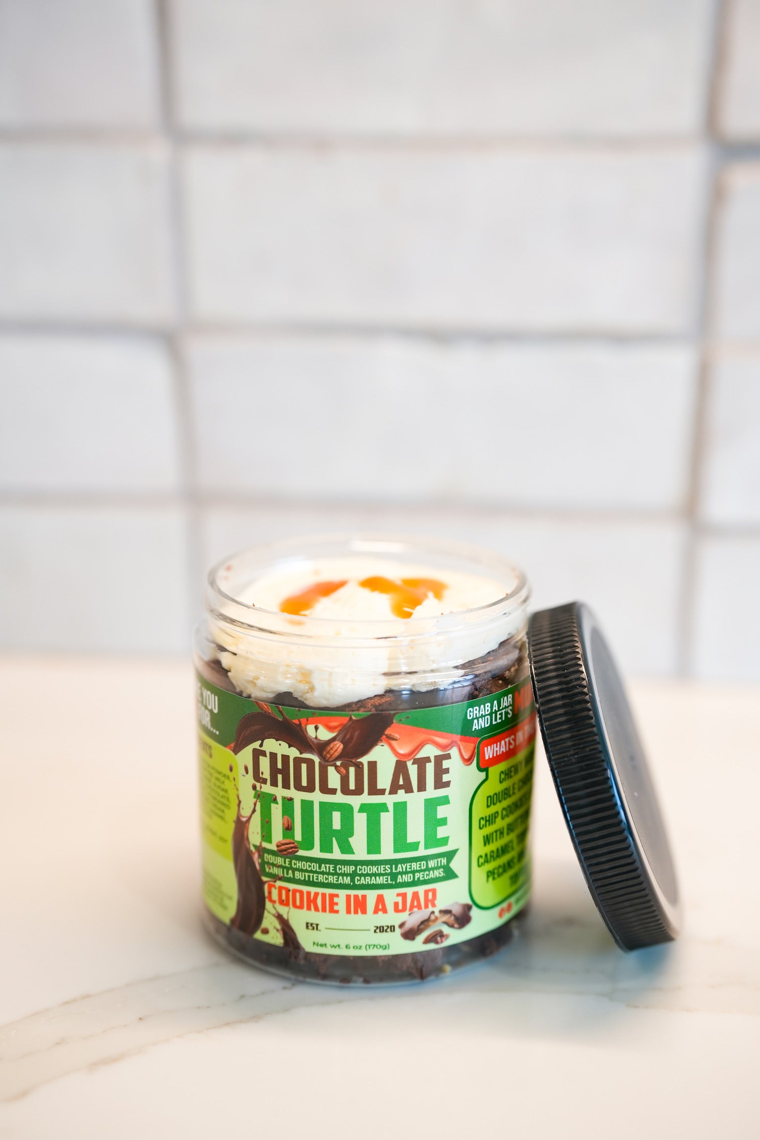 Our Chocolate Turtle MUNCH-O In A Jar includes our Double Chocolate Chip Cookie together with Caramel Buttercream, Caramel and Chocolate drizzle, combined with Pecans and Heath Toffee pieces.