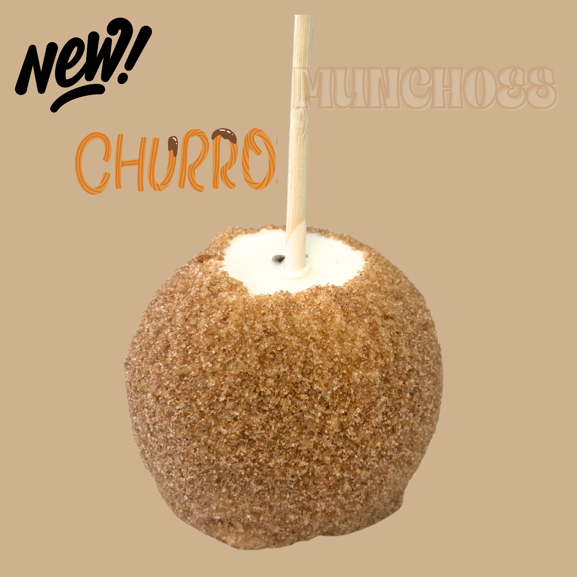 Our Churro Gourmet Apple consist of a delicious Granny Smith Apple dipped in top quality homemade Caramel, dipped in White Chocolate, and rolled in cinnamon & brown sugar. If you're an apple pie fan, you're going to LOVE churro!!